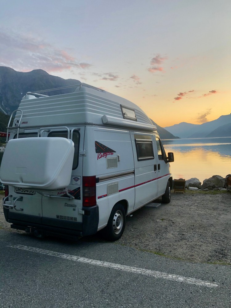 Trekker inn i bobilen når det blir kaldt. Jeg har fortsatt panoramautsikt til siste rest av solnedgangens show.